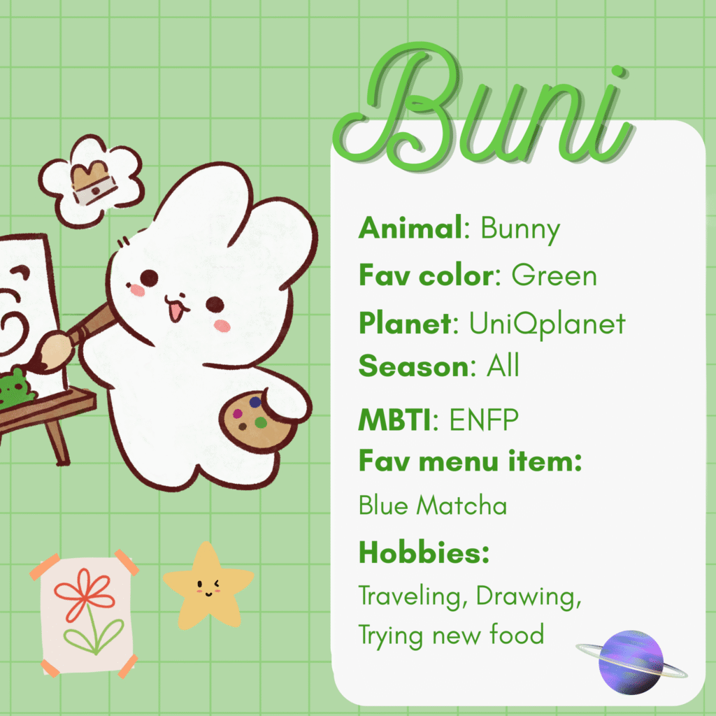 Moony en Buni zijn de grondleggers van UniQplanet. Ze vormen samen het hart van onze planeet en zijn er altijd. Ze zorgen ervoor dat alles draait en blijven het hele jaar aanwezig. Moony is geïnspireerd op Betul en Buni op Aleyna. Bovendien betekent onze achternaam Koç in het Turks “ram” (het dier), wat symbool staat voor kracht en doorzettingsvermogen, net als onze planeet.